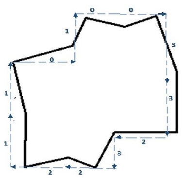 El código de cadena genera una secuencia de números que representan las orientaciones de los segmentos conectados consecutivamente, partiendo de un punto del contorno y siguiendo las agujas del reloj, es una representación invariante frente a traslaciones, esta propiedad facilita la comparación de objetos, permitiendo obtener características del contorno, como lo son el perímetro y el área del objeto. Sin embargo, solo se consideran para este trabajo segmentos usando vecindad de 4N con una pendiente kπ/2 (considerando que el borde es una curva 4N), con k=0, 1, 2, 3, que se caracterizan porque su código de cadena tiene un solo código k que se repite. Como se puede ver en el ejemplo de la Fig. 5 la aplicación del código de cadena a un contorno simple, usando un entorno de 4 vecinos como se muestra en la Fig. 4 (a). (Galdir ycol., 2015).
