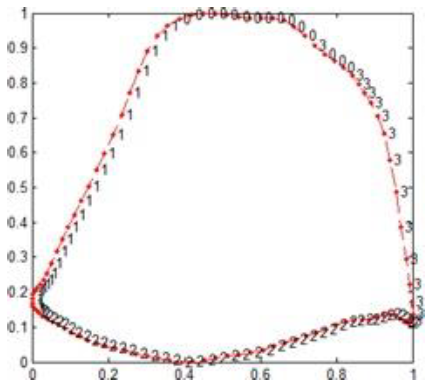 (24)Para analizar los ángulos y los segmentos aproximados de las líneas, la representación de la forma del código de la cadena se utiliza en función del código de cadena de Freeman. En la Fig. 5, se genera un código de cadena a partir de un contorno simple. Usando un código conectado en 4 como ejemplo (ver Fig. 4.a). Los ángulos extraídos de las cartas dinagráfica ahora se pueden usar para extraer el código de cadena, donde cada ángulo se codificará en uno de los 4 códigos. La ecuación 25 se usa para generar el vector de código de cadena. La Fig. 7 muestra un ejemplo de carta dinagráfica de fondo de pozo de contorno simple después del proceso de normalización con cada uno de sus puntos marcados con el código respectivo.