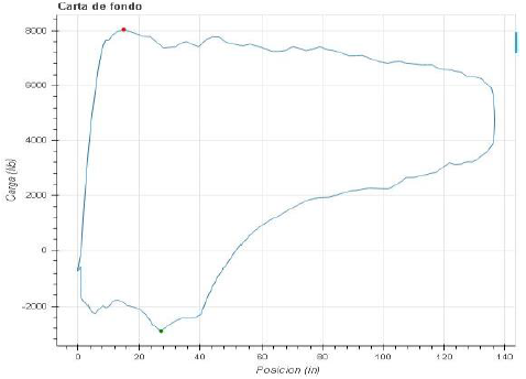 Ingresando los datos de la tabla 1 en el SvMD desarrollado, se logran obtener las gráficas de las figuras 8 y 9 que representan la carta dinagráfica de referencia del pozo en estudio (ver Fig. 8 y Fig.9), distinguiéndose en la parte inferior del gráfico la carta de fondo y en la parte superior se detalla la gráfica de la carta de superficie. Al comparar las figuras 8 y 9, se observa la similitud entre ambas, probando de esta manera que el SvMD genera una aproximación sobre la carta dinagráficas de fondo.
