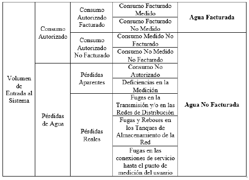 Como puede apreciarse en el esquema de la Figura 1, (Farley y col., 2008) el Agua No Contabilizada se compone de diferentes aspectos a considerar, tal vez los más importantes, son los referidos a las Pérdidas Aparentes, y las Pérdidas Reales.