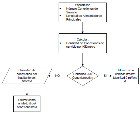 Lo anterior demuestra la sensibilidad del indicador, por lo que se propone como metodología de selección del indicador para la estimación de las pérdidas reales en el sistema, lo expuesto en la Figura 2, y tomando en cuenta que el Índice Lineal de Pérdidas se puede calcular como la relación entre el volumen anual perdido y la longitud de la red, expresado en m3/km/h.