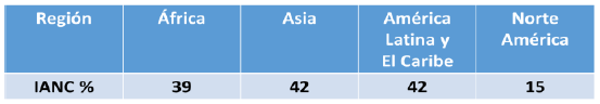 Se puede observar que en América Latina y El Caribe el promedio del IANF en sus grandes ciudades es del 42%. Valores similares se registran en Asia y África, con 42% y 39% de IANF respectivamente. En América del Norte el IANF promedio es del orden del 15% en sus grandes ciudades.