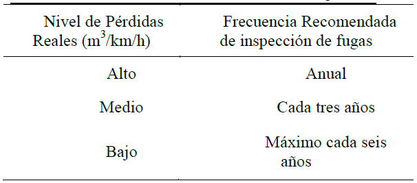 Liemberger (s/f), en su análisis sobre la Norma vigente en Alemania, expone en detalle la experiencia en este país sobre la estimación del indicador para las pérdidas reales, haciendo referencia a los planes de monitoreo y su periodicidad en los diferentes componentes del sistema, de lo cual se obtiene la siguiente recomendación, de acuerdo al indicador estimado, mostrado en la Tabla 1.