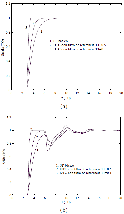 Para verificar las mejoras introducidas por el DTC con filtro de referencia de la figura 3b, se implementa el mismo sistema del caso anterior, pero con un retardo L=3. El filtro F(s) corresponde a la ecuación 7 con To=1, los valores de los parámetros del controlador son: Kc=1, τi=1, ecuaciones 7 y 8. En la figura 9(a) se aprecian las respuestas del sistema variando el valor de la constante del filtro T1. La figura 9(b) corresponde a la respuesta ante un error de modelado en el retardo, en donde Ln=3,5.