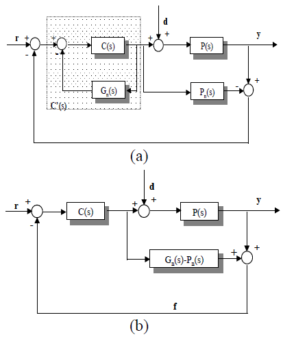 Ya se ha mencionado que el SP fue el primer esquema de control propuesto en la literatura que incluye un compensador de retardo y además es probablemente el sistema más conocido y utilizado en la práctica para resolver el control de los sistemas con retardo. En la figura 1a se puede apreciar la estructura del SP, los bloques C(s) y P(s) corresponden respectivamente al controlador primario y a la planta real con P(s) = G(s)e-Ls donde L es el retardo de tiempo. En esta estructura se realimenta la predicción de la salida del proceso calculada usando un modelo de la planta sin retardo Gn(s). Además, para compensar el efecto de las perturbaciones y corregir los efectos que produce el error de modelado, se realimenta también la diferencia entre la salida del proceso y la salida del modelo incluyendo el retardo estimado (Pn(s) = Gn(s)e-Lns).