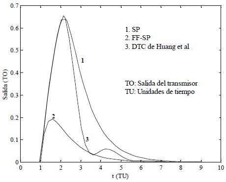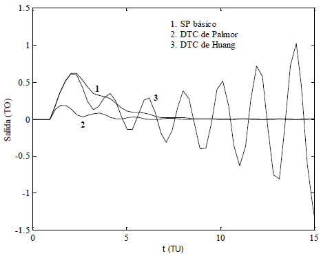 En ambos casos se aprecian las mejoras introducidas por los DTCs propuestos. Claramente se observa que el FF-SP presenta el mejor comportamiento, (ver Tabla 3 para verificar el índice ISE para los tres sistemas); sin embargo, hay que recordar que este esquema solamente puede ser implementado cuando la perturbación es medible.