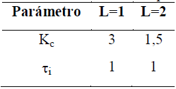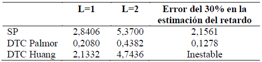 (11)Se tienen dos casos para los cuales el retardo L toma los valores L=1 y L=2 respectivamente asumiendo modelado perfecto. Los parámetros de ajuste para el controlador PI de ambas estrategias y los parámetros del filtro Q(s) se obtienen según (Palmor 1996, Huang y col., 1990) y se muestran en las Tablas 1 y 2.