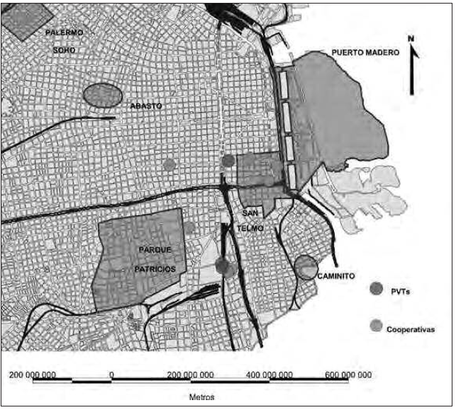 Finalmente, también en la misma década, los barrios de Palermo Viejo y Palermo Pacífico, en el centro-norte de la ciudad, se rebautizaron mediáticamente como Palermo “Soho” y Palermo “Hollywood”, respectivamente. Se trataba de espacios vinculados con la pequeña industria y tiendas de poca sofisticación, que actualmente concentran varios centenares de nuevos comercios repartidos en los rubros de la moda, la gastronomía y el diseño, conformando un típico barrio artístico y clúster de ocio similar a los que se pueden encontrar en otras zonas de renovación urbana de otras muchas grandes ciudades (Carbajal 2003). Aunque se trata de un tipo de transformación más espontánea que en los casos anteriores, la tematización de la zona se ha visto reforzada por la más reciente política de polos y distritos del gobierno de la ciudad. Otros de los sectores centrales donde está teniendo un fuerte impacto esta política son Parque Patricios y Barracas, donde se ha intensificado notablemente la renovación urbana y se han revalorizado los precios de la vivienda.