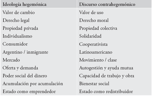 El trabajo de campo ha reflejado tanto la existencia de un discurso contrahegemónico, esperable en una organización militante, como las fracturas que el mismo genera al interior de las cooperativas. La interpretación que aquí realizamos es que esta fractura interna es expresión de un conflicto ideológico por las formas legítimas de usar el espacio. En este último punto se encuentra el núcleo ideológico de la disputa por la centralidad: propiedad colectiva, solidaridad y valor de uso frente a la racionalidad puramente económica, individualismo, fragmentación y valor de cambio (ver cuadro 1).