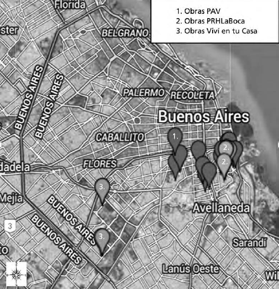 En contraste, la distribución de los inmuebles autogestionarios del PAV mostró una concentración en la zona sur de la ciudad, en los barrios de La Boca, Barracas y Parque Patricios, pero también –en menor medida– en Constitución, San Cristóbal, San Telmo, Balvanera (zona centro) y en casos aislados ubicados en Chacarita, Caballito, Villa Crespo y Palermo “Soho” (zona norte)–. Lo importante a remarcar aquí es que ninguna operatoria del PAV se localizó en la comuna 8 (tradicionalmente reservada para vivienda social), pues fueron los propios destinatarios los que, como parte del proceso autogestionario de sus viviendas, decidieron la ubicación de sus terrenos y salieron a buscarla. Ahora bien, esta capacidad de compra de tierra en la CABA por parte de los destinatarios del PAV quedó supeditada a una variedad de elementos: las capacidades de las cooperativas de salir a comprar inmuebles en el mercado; la eventualidad de los procesos especulativos que se acentuaron en la ciudad durante los últimos años en un escenario estatal de desregulación de esta especulación; y los tiempos de gestión del IVC y el Banco Ciudad. Según los testimonios de las organizaciones sociales, después de 2006, con la disparada de los precios en general y el boom de la especulación inmobiliaria en la ciudad, la compra de los inmuebles se tornó uno de los problemas más críticos del PAV.