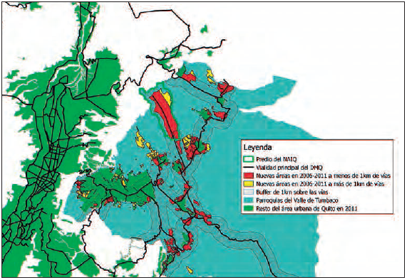 Las vías han actuado en las últimas décadas como expansores urbanos, lo que puede apreciarse mediante herramientas estadístico-espaciales. El siguiente mapa muestra que en el 90,3% de la Administración Zonal de Tumbaco, los nuevos desarrollos urbanísticos (2006-2011) están en el radio de 1 km de la vialidad previamente existente, de color rojo. El color naranja corresponde a los nuevos desarrollos urbanísticos más lejos de 1 km de las vías que suponen el 9,7% del total.