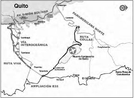 Los distintos grupos de poder presionaban para la construcción del nuevo aeropuerto: especialmente significativo fue el apoyo de la Cámara de Comercio de Quito a través de la prensa (El Comercio 2006). La Cámara de Turismo considera el NAIQ como una de las peticiones históricas del sector para dinamizar los flujos internacionales (entrevista al sector empresarial 3). Por otro lado, el gremio de exportación florícola, representado por la Asociación de Productores y Exportadores de Flores (EXPOFLORES), consideraba el nuevo emplazamiento del NAIQ el lugar idóneo por las posibilidades que ofrece Tababela, especialmente por dos factores: la cercanía a los grandes centros de producción y la facilidad para la operación, ya que la altitud menor a 3 mil metros, que incrementaría notablemente la capacidad de cargo de los aviones y reduciría los costes de operación (entrevista al sector empresarial 2). Los intereses más evidentes fueron protagonizados por el sector inmobiliario, representado por la Cámara de la Construcción, que ha apostado de forma sucesiva por la expansión de la ciudad a los valles orientales, obteniendo espectaculares plusvalías por la especulación relativa al suelo y la construcción de nuevas urbanizaciones en todo el área (Bayón 2014, 108-110). Estos sectores manifiestan su agrado y una buena interlocución con las distintas administraciones municipales. Por último, las empresas concesionarias del aeropuerto han obtenido las ganancias por la propia operación del NAIQ una vez el mismo ha entrado en funcionamiento (entrevista al sector empresarial 1).