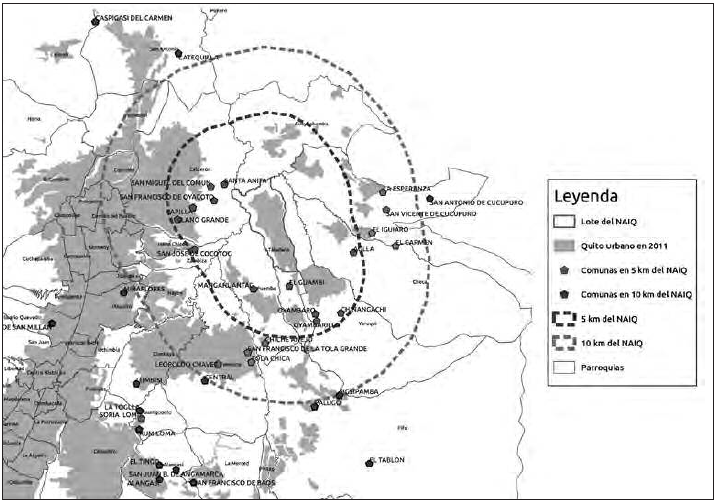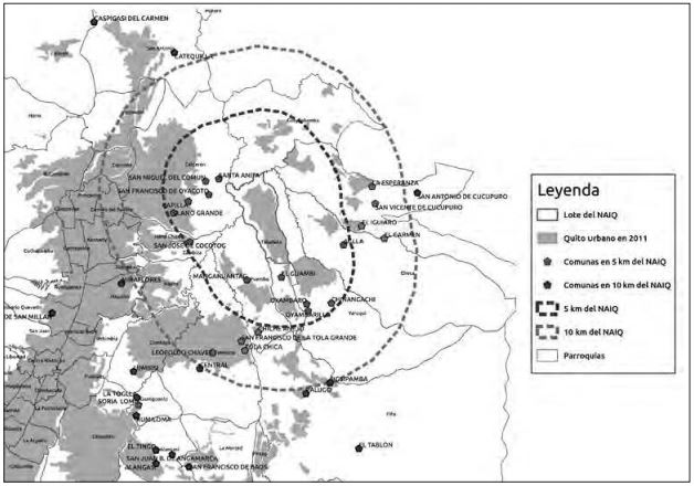 Ello supone una reterritorialización del espacio periurbano, pues una fuerte intervención pública modifica completamente la propiedad y los usos del espacio, y está encaminada a expandir la urbanización sobre áreas previamente rurales. Ello se produce en un espacio con un fuerte ejercicio de territorialidad de apropiación: donde se ubica el NAIQ es un área con una alta densidad de comunas indígenas en el Distrito Metropolitano de Quito (DMQ), 20 en un radio de 10 km. Por ello, la dialéctica de territorialidades se produce de forma intensa, con modelos territoriales antagónicos: las comunas caracterizadas por la organización colectiva del territorio y los usos predominantemente agrarios, frente a un modelo urbano en el que las actividades inmobiliarias especulativas se expanden a través de las nuevas vías de interconexión con la ciudad.