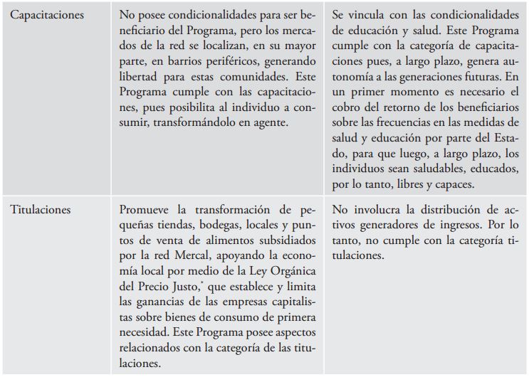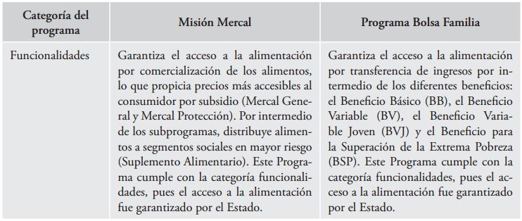 En la comparación de los programas alimenticios observamos que ambas acciones antipobreza (Programa Bolsa Familia y Misión Mercal) cumplen con el objetivo de reducir el hambre, pero de maneras distintas. El Programa Bolsa Familia, por medio de la distribución de pequeños ingresos a las familias permite la compra de alimentos, ampliando la seguridad alimentaria de las mismas al posibilitar que se alimenten con mayor calidad y regularidad.