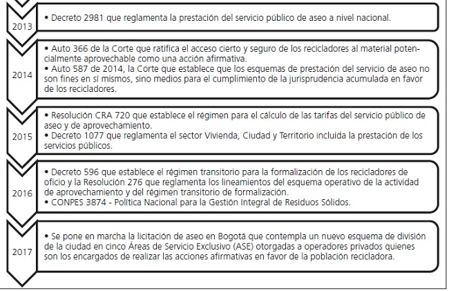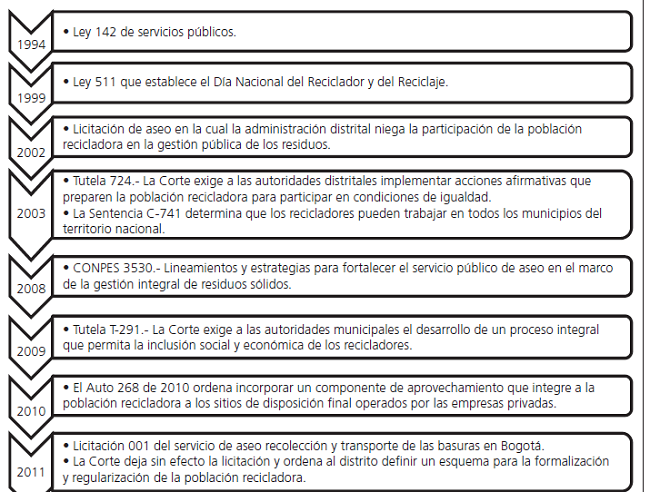 El reconocimiento y visibilización de la labor del reciclaje en Colombia es el resultado de una lucha de la población recicladora (Rosaldo 2015) que, a partir de su exclusión y marginalización, inició un proceso de incidencia política para ser no solamente reconocidos, sino exigir al Estado y a la sociedad la justa compensación por el trabajo que realizaba. El país ha desarrollado un proceso de inclusión progresiva junto con un cambio en el paradigma en la gestión de residuos. 2