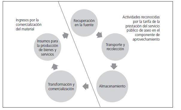 Los recicladores tienen dos fuentes de ingresos: i) la tarifa de aprovechamiento por la prestación del servicio público; y ii) la venta del material. Antes de la expedición del Decreto 596, en Bogotá se remuneraba individualmente a cada reciclador (Decreto 564 de 2012). De esta manera, cada dos meses el reciclador recibía la transferencia equivalente a la cantidad de toneladas registradas y aprobadas por la institucionalidad. Con el Decreto 596 se establece que la tarifa debe ser pagada a la organización, después de haber validado la cantidad de material registrado en el SUI. Sin embargo, esta tarifa no corresponde al total de toneladas recuperadas y transportadas, sino el material vendido. Es decir, no se está reconociendo la prestación de un servicio, sino la comercialización del material, situación que acrecienta la vulnerabilidad de los recicladores y sus familias, colocándolos a la merced, hoy más que nunca, de los intermediarios y de la gran industria. A continuación, se puede observar las diferentes actividades realizadas por los recicladores distinguiendo aquellas que se incluyen dentro de la prestación del servicio, siendo remuneradas vía tarifa, y las que corresponden a la venta del material: