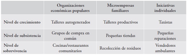 La variedad de actividades desarrolladas en el marco de la economía popular tornan compleja la tarea de definir un sujeto representativo de este sector. Favreau y Échette (2002) proponen una matriz de análisis que relaciona los niveles de desarrollo de las actividades con las formas organizativas que pueden ir desde lo individual, pasando por lo familiar, a lo comunitario.