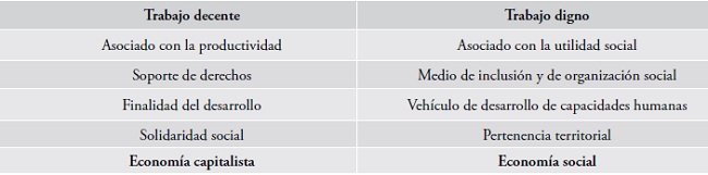 Los límites en la generación de empleo movilizaban expectativas y carriles diferenciados de integración: uno sostenido en el “trabajo decente”, productivo, registrado y, como tal, soporte de derechos y protecciones; otro, el “trabajo digno”, asistido por el Estado, en un circuito local de economía social. Se argumentaba que éste constituía un subsistema económico cuya racionalidad, eminentemente social y no orientada a la acumulación, permitía la inscripción de los sujetos en lazos productivos de proximidad mediante los cuales recuperar “saberes y haceres” (MDS 2010, 189). El trabajo digno refería a un trabajo comunitario y organizado (realizado en y para la comunidad), que constituía una vía de integración propiamente local de los sujetos. El valor del trabajo realizado se fundamentaba en su aporte a la comunidad (MDS 2007, 2010).