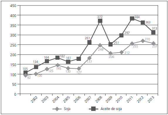 El insólito crecimiento del agronegocio en Paraguay responde a varios factores, algunos ligados con cuestiones institucionales como los altos niveles de corrupción, las peculiaridades de su estructura de clases con el notable peso de la oligarquía en el control del Estado, la calidad de sus recursos naturales, las tasas impositivas muy bajas y las condiciones favorables de los mercados internacionales con el sustancial aumento de la demanda de las commodities, particularmente del aceite de soja y de la semilla de soja. El notable incremento del precio de estos productos se refleja en la distribución presentada en la figura 1; así, el precio del aceite de soja entre 2002 y 2013 se multiplicó por más de tres. El incremento de los precios que impulsó el boom de las commodities cesó en 2013, pero la caída posterior no frenó la expansión de la soja que seguía siendo altamente rentable.
