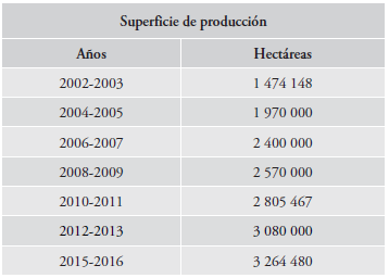 El referido desarrollo asociado con la mayor economía de la región determina, en las décadas siguientes, cambios sustanciales en la estructura social con la sojización de la región oriental. El nuevo modelo extractivo con escasas regulaciones responde a la lógica de enclave ligado con Brasil y representa una nueva relación sociedad-naturale za, en tanto la naturaleza desempeña un papel de proveedor de recursos sin conside rar sus límites, ya que la soja transgénica reduce la sustentabilidad de la producción al no reponer, en tierras aptas, ni la mitad de los nutrientes extraídos. La misma lógica extractiva que lleva a la destrucción de los recursos naturales y a la alarmante defo restación que contribuye también al cambio climático termina castigando a los más pobres que sufren las consecuencias de la expansión del cultivo de soja transgénica (Fogel 2015). La expansión de la producción de la soja transgénica se multiplica por tres en los años 2001-2016, llegando a 3 080 000 hectáreas y a 9 millones de tonela das en la campaña 2012-2013; la superficie cultivada es tan notable que desde el año agrícola 2002-2003 al 2015-2016 se multiplicó por 2,2 (cuadro 1).