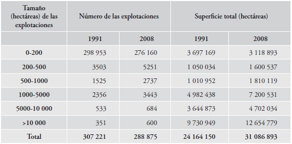 El proceso de concentración de la tierra que se acentúa con la expansión del agro negocio resulta notable desde mediados de la década de 1990, tal como puede verse examinando los cambios en el período intercensal 1991-2008. Por una parte, se ob serva la expansión de la frontera agrícola y, por otra, la disminución de las explotacio nes menores a 200 hectáreas, tanto en cantidad como en superficie, en contraste con las explotaciones mayores en tamaño que crecieron en los mismos aspectos (cuadro 3). El proceso de concentración de la tierra está estrechamente asociado con su aca paramiento por parte de productores brasileños que, en una suerte de prolongación de la economía brasileña, controlan la mayor parte de superficie de los departamentos fronterizos.