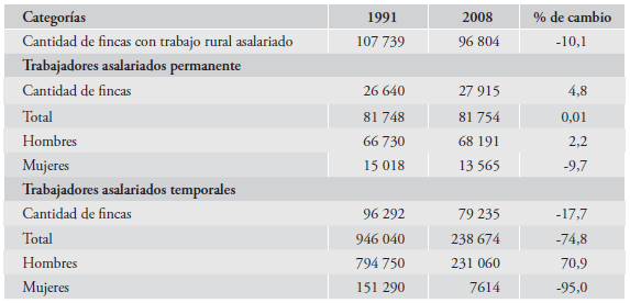 Con el marcado predominio del capitalismo agrario, corporizado en las empresas sojeras, no se dio un proceso de proletarización campesina que hubiera permitido la explotación del trabajo de los campesinos separados de sus medios de produc ción. Estos, ya desarraigados, optan por la migración; de hecho, con la expansión del agronegocio sojero, el trabajo asalariado temporal demandado básicamente por las unidades productivas campesinas disminuye entre 1991 y 2008 en un 75%, llegando la caída del empleo femenino a un 95% durante ese período, debido a la sustancial disminución de la producción de algodón, la disminución de unidades productivas campesinas y la pulverización de los minifundios. Sin embargo, el empleo asalaria do rural permanente no sufrió cambios en el período referido, permaneciendo en 81 700 trabajadores (cuadro 5).