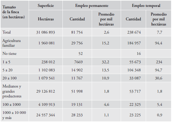 En las condiciones de deterioro de la agricultura campesina, la misma pierde ca pacidad de retener a la fuerza de trabajo familiar. Así, mientras en el año agrícola 1990-1991, considerando la población apoyada por servicios de asistencia técnica, tenían 6,8 personas por finca, esta cantidad se reduce a 3,8 en 2012-2013 (Birbau mer 2017). La intensidad del desplazamiento de la fuerza de trabajo campesina por el agronegocio sojero se aprecia en la distribución del cuadro 6, donde se puede apreciar que, mientras las explotaciones menores a cinco hectáreas generaron en promedio empleo para 32 trabajadores permanentes y 234 trabajadores temporales por mil hec táreas, las explotaciones de mil hectáreas y más emplearon solo a un total de 28 233 empleos permanentes, lo que representa 1,1 trabajador por mil hectáreas. El trabajo temporal proporcionado por estas grandes explotaciones es menos de un trabajador. Esta disminución de la fuerza de trabajo implica también la reducción de fuerza de trabajo para la propia producción de subsistencia (Weisskoff 1992) que hubiera per mitido subsidiar la fuerza de trabajo para el agronegocio que, como se vio, considera innecesarios a trabajadores campesinos; la contribución campesina al agronegocio se da por medio de la desposesión de sus tierras y los campesinos ya desarraigados optan por la migración.