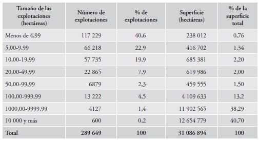 El estrato siguiente de explotaciones que llegaban a 66 218 unidades productivas tiene una superficie media que no llega a siete hectáreas y se desenvuelve también en condiciones muy precarias en cuanto al medio básico de producción que es la tierra. El proceso de minifundización en los años 2001-2016 ha disminuido aún más el tamaño de estas parcelas que representan, entre los dos estratos de minifundios, el 63,5% del total de unidades productivas rurales.