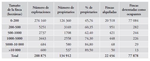 Por lo menos una parte de estos detenta tierras que son bienes públicos y que con forman casos emblemáticos de acumulación por desposesión. Por ello, resulta notable que 268 grandes productores con fincas mayores a mil hectáreas fueran registrados en el Censo de 2008 (MAG 2009) como meros ocupantes, pero podría suponerse que se trata de tierras fiscales y que quienes las poseen están usurpando bienes públicos.