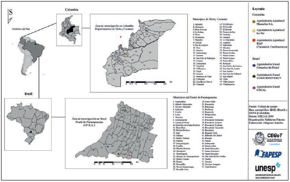 Los dos territorios analizados forman parte de áreas de avance territorial de los culti vos flexibles entre 2000 y 2015, período en el cual se produce el aumento del precio de las commodities (azúcar y aceite de palma) y un apoyo político por parte de los Estados para la producción y uso de agrocombustibles. En el caso colombiano, se toma la palma de aceite y su expansión hacia el oriente del país, específicamente en el departamento del Meta y Casanare; para el caso de Brasil, se toma el Pontal do Para napanema, localizado al suroeste del estado de São Paulo, área hacia la cual el cultivo de caña de azúcar ha avanzado en la última década.
