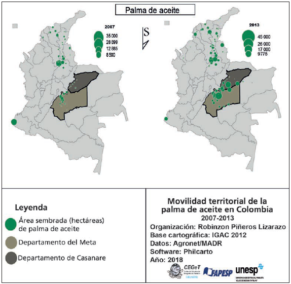 El mapa 2 representa a los municipios que tienen plantaciones de palma de aceite y caña de azúcar en Colombia en 2007 y 2013. Puede identificarse el despla zamiento de estos cultivos hacia el oriente del país, específicamente hacia los de partamentos estudiados, territorializándose en el piedemonte llanero y parte de la denominada altillanura (Departamento Nacional de Planeación 2011; FAOSTAT 2017). Por lo tanto, pasaron a disputar tierras utilizadas por la ganadería, el cultivo de arroz, así como tierras baldías de campesinos y latifundios de narcotraficantes y paramilitares; este proceso hizo que estos dos departamentos pasaran de 120 304 hectáreas en 2007 a 257 337 hectáreas en 2013, es decir, pasaron de concentrar el 37,3% al 48,11% del área sembrada de palma en el país (AGRONET 2017). La integración de estas nuevas áreas de cultivo significó un mayor volumen na cional de producción de aceite de palma, lo que posicionó al país como el cuarto productor mundial de esta commodity9 y el mayor productor en América Latina (FAOSTAT 2017).