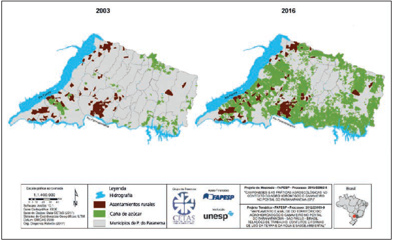 Por otro lado, en el oeste del estado de São Paulo en Brasil, en el Pontal do Pa ranapanema, entendido como 32 municipios agrupados en la União de Municípios do Pontal do Paranapanema, según los datos del Instituto Brasileño de Geografía e Estadística (IBGE 2017), en 2003 se sembró 68 417 hectáreas y para 2016 aumentó a 389 473 hectáreas, es decir, se produjo un crecimiento del 600% en apenas 13 años. Esta rápida expansión del monocultivo se produjo en un territorio con áreas de pastaje y haciendas producto de la ocupación ilegal (grilagem) de tierras públicas (devolutas) que, en el proceso de expansión del agrohidronegocio de la caña de azúcar, se aliaron con los latifundistas mediante el arrendamiento de tierra, legitimando de facto la posesión ilegal (Feliciano 2009).
