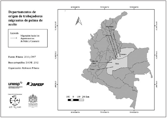 La migración de trabajadores en la expansión del cultivo de palma de los últimos 10 años hacia el oriente proviene en mayor medida de dos regiones. En primer lu gar están los que provienen del norte del país, de municipios con plantaciones de palma del departamento del César, Santander y Magdalena. Estos se agrupan indis tintamente como “los costeños” y “santandereanos”, por su acento, juventud, rasgos físicos y experiencia en el trabajo de la cosecha de palma, ya que vienen de áreas pal meras representadas. En sus trayectorias laborales y personales de migración aparecen como expulsores la violencia paramilitar, el desempleo y los bajos salarios que reciben por sus labores en la palma de aceite en empresas del norte, las cuales son a destajo e intermediadas por cooperativas de trabajo asociado (CTA). En los “llanos”, así se conoce popularmente a las planicies del oriente de Colombia, también hay interme diación laboral por medio de sociedades anónimas simplificadas (SAS) y empresas de servicios temporales (EST), pero ofrecen mejores salarios según la labor y la unidad de medida utilizada por la empresa (jornal, tonelada, racimo, entre otros).