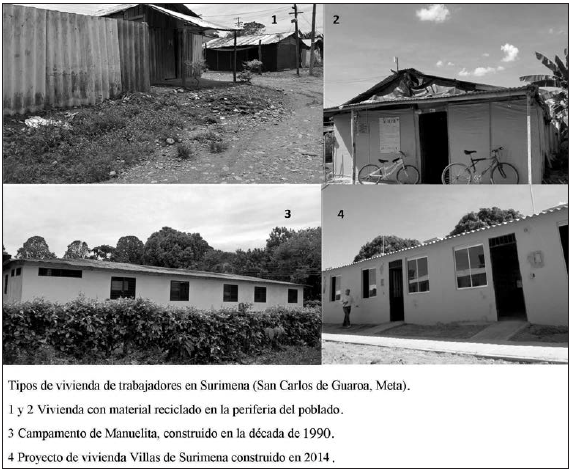 A estas condiciones de precariedad laboral se suman las formas de habitación para los trabajadores y las diferentes formas de migración. Entre estos están aquellos que se quedan por cosechas o temporadas más largas, así como los que se instalan defi nitivamente. La migración está relacionada directamente con el trabajo en la palma, situación que es aprovechada por las empresas palmeras y los intermediarios para ejercidas mediante la concentración temporal o estable de trabajadores en pequeños poblados cerca de las plantaciones, los cuales han crecido en población durante esta fase de expansión del área sembrada del agrohidronegocio palmero. El asentamiento de la fuerza de trabajo agrícola produce diferenciaciones sociales y culturales vincula das con el tiempo de llegada, el origen migratorio, las funciones en las plantaciones y las migraciones estacionales que hacen que los trabajadores vivan en habitaciones o casas alquiladas, alojamientos de la empresa, casas de programas de vivienda social empresarial o casas construidas con materiales reciclados. Este es el caso de Surimena, San Carlos de Guaroa (Meta), poblado rural que concentra a trabajadores agrícolas, especialmente de la Translatina Manuelita SA, en el que pueden observarse los dife rentes tipos de vivienda de los trabajadores (imagen 2).