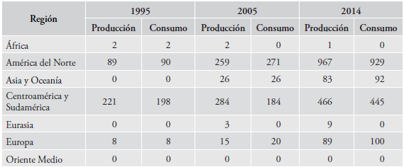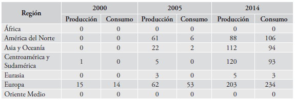 En la tabla 2 está la producción de agrodiesel en la cual Europa se destaca por su utilización en mezcla con el diésel para autobuses y camiones a partir de 2001, con la política europea de transportes de 2002 y la directiva comunitaria 30 de 2003,2 que articulan el uso de agrocombustibles con los compromisos pactados en el Pro tocolo de Kioto. Sin embargo, la producción de agrodiesel en Europa no tuvo ac ceso a la cantidad de materia prima necesaria y avocó por la importación de aceite de palma del sur de Asia, África y América Latina; en este último, sus principales proveedores son Colombia, Ecuador y Honduras. Según los datos presentados, Europa ha sido la región con más producción y consumo de agrodiesel durante el período 1995-2014, pero a partir de 2005 aparecen Asia y América Latina como productores debido a la promoción de políticas de producción y consumo de agro combustibles, también vinculadas con compromisos nacionales en el marco del Protocolo de Kioto.