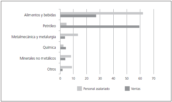 Dichos sectores productivos son centrales en términos de la matriz productiva de Mendoza. En términos de participación, en el PBG la producción de alimentos y bebidas (de base frutihortícola y vitivinicultura como principales) explica el 6% del PBG y el 35% del producto industrial y la producción de combustibles y otros deri vados del petróleo el 7% y el 43%. Subsidiariamente se encuentran las actividades de químicos, maquinarias, mecanizados y estructuras metálicas, productos en madera, plástico, vestido y otras en menor medida. La participación relativa de cada actividad en la producción industrial (gráfico 1) según ventas (a valores nominales) y personal asalariado en 2014 fue del 27% y 62% alimentos y bebidas; 59,2% y 4,8% petró leo; 3,7% y 13,4% metalmecánica y metalurgia (agrupando fabricación de metales comunes, productos de metal y maquinaria); 4,3% y 2,7% química; 3,9% y 8,3% minerales no metálicos (DEIE 2014).