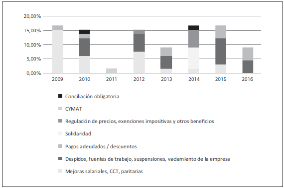 Tomando el total de acciones conflictivas del período, las principales demandas de los trabajadores fueron por mejoras salariales (pedidos de incremento y efectiviza ción del cobro) 30% de las acciones y convenios colectivos 5%; por pagos adeudados 15%; despidos, por fuentes de trabajo y cierre o vaciamiento de empresas (sobre todo en el sector agroindustrial) 30%; por solidaridad con trabajadores despedidos del sector automotriz a nivel nacional 7,5%; por regulaciones de precios, exenciones impositivas y otros (productores olivícolas y vitivinícolas) 7,5%; condiciones de tra bajo 2% y conciliación obligatoria 3%. Cabe destacar durante el período la propor ción de acciones conflictivas en la industria cuyos motivos fueron despidos y pagos adeudados (45%) que superaron los reclamos salariales (35%) en comparación con las demandas de trabajadores en el total provincial (14% y 47% respectivamente) (OCSMza 2017). En el gráfico 2 se presenta la participación relativa de las acciones conflictivas por año según demanda, sobre el total de acciones ocurridas durante el periodo 2009-2016.