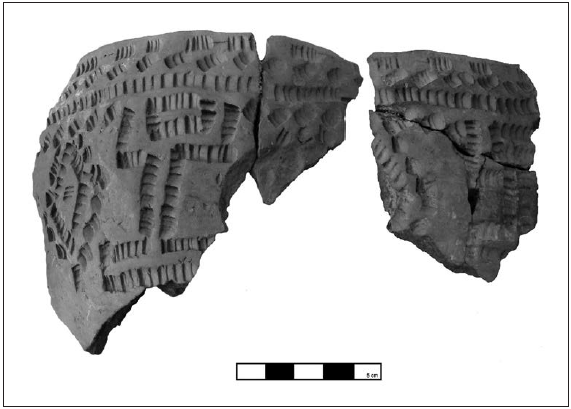 Sobre la cerámica de Calera, se realizaron diversos estudios para conocer cuestiones tecnológicas, funcionales y estilísticas (Di Prado 2013). Los mismos permitieron saber que en la confección de la pasta se mezclaron fuentes de arcillas de diversos tipos y orígenes, y se utilizaron tiestos molidos como antiplástico. Lo significativo es que en otros restos de cerámicas procedentes de la región no se encuentra el uso de esta clase de antiplástico, práctica que efectivamente ocurre más al norte y en la depresión del Salado. Este aspecto puede ser explicado como una forma de reutilización económica, pero también como una tradición de los alfareros de preservar el vínculo entre las vasijas y los ancestros. En ese sentido, la decisión de agregar tiesto molido podría formar parte de una manufactura de tradición local muy puntual o interpretarse como el resultado de la interacción de personas, objetos y/o conocimientos provenientes de otras zonas de la región pampeana (Di Prado 2013, 291-293). Por su parte, las representaciones decorativas más empleadas en la alfarería son el surco rítmico e inciso de línea llena con “escalones”, características presentes en distintas áreas de la región pampeana. No obstante, se destaca un diseño antropomórfico cuya presencia es excepcional por ser el único encontrado hasta el momento en la región. El mismo se ubica en un sector visible de lo que fue un cuenco de tamaño grande, sin alteraciones de uso y asociado con el servicio de alimentos y/o bebidas (Di Prado 2013). Tanto la forma de la cerámica como el lugar destinado a los diseños sobre la misma reafirman la hipótesis arqueológica de la funcionalidad ritual, como un posible sitio de banquetes o festines (Di Prado 2013; Politis et al. 2005).