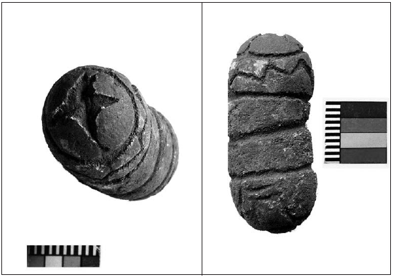 Por su parte, la presencia de diseños en zigzag y rombos de la cerámica es entendida desde la lógica del mapunche kimun como un recurso que podría representar el movimiento, la dinámica, la continuidad, es decir, la vida y las otras dimensiones de la vida. La vida no está concebida linealmente sino que se la entiende sin principio ni fin. El rombo, en este sentido, remite al origen de la persona y del mismo cosmos. Por eso también es común no solo en la cerámica, sino también en el tejido y la platería. El zigzag en este caso con la cruz central se repite en la pieza cilíndrica realizada sobre un bezoar gástrico11 (imagen 4), a la que se suman cuatro líneas concéntricas que dividen la pieza y que aluden a los cuatro elementos y también a las cuatro dimensiones, lo que estaría, en última instancia, marcando la temporalidad y la espacialidad. La aparición de un rombo o cruz en el centro también es significativa. Todos estos tipos de elementos cobran sentido desde la lógica mapunche si están unidos a otros, dentro de una composición más amplia, como en los tejidos o en el caso de la cerámica, en todo el cuenco. El desafío que presenta esta pieza sobre bezoar es su particularidad “fuera de contexto”, este objeto (con sus diseños) podría haber estado contenido en otra cosa.