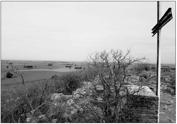 Por último y en estrecha relación con los casos anteriores, en Boca de la Sierra la presencia de piedras para construir sus herramientas lo convierte en un espacio que, desde el mapunche, posee un valor que trasciende lo utilitario y lo económico. El hecho de buscar y relacionarse con ese determinado elemento (roca) también podría vincularse con prácticas rituales particulares que se habrían efectuado para “extraerlo de la naturaleza”. Las ceremonias para pedir permiso dan cuenta que cada elemento tiene su pilli y su newen. Pero más allá de la existencia de una ocupación humana previa “comprobada científicamente”, este lugar ya era, y es, utilizado por agrupaciones indígenas que encuentran allí un espacio que consideran ancestral por las energías que posee. La comunidad mapuche Pillán Manque lo denomina askintwe, es decir, un mirador desde el cual observar y controlar, pero también realizar encuentros espirituales. Otro punto interesante que podría indicar su valoración en tanto espacio de ceremonias rituales es que, como ha sucedido en cantidad de otras oportunidades, se ha colocado/impuesto un símbolo cristiano en su cima, silenciando las significaciones socioculturales preexistentes. Dentro de esta lógica, el nombre San Cayetano tiene una clara intencionalidad (imagen 5).