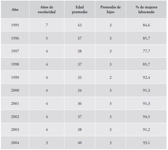 En cuanto a las características sociodemográficas de personas trabajadoras textiles, los datos de la ENE (cuadro 1) destacan un predominio del género femenino y creciente que pasó del 84,6% en 1995 al 93,1% en 2004. Durante el período examinado, el promedio de edad de personas trabajadoras fluctuó entre los 34 y 43 años. Mientras que el número promedio de hijos ha permanecido constante en 3 hijos(as). Es notable la disminución en los años de escolaridad, de 7 años en 1995, a 3 años en 2004.