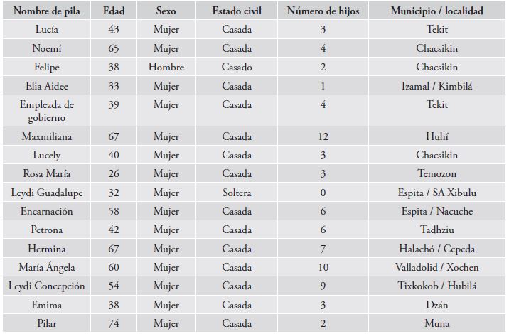Posterior al trabajo de gabinete, se realizaron visitas a los municipios donde se registró el mayor porcentaje de trabajadores a domicilio en la rama textil de acuerdo con los resultados de los datos de la ENE, además de considerar la opinión de los especialistas entrevistados en Mérida para la selección de municipios. En la muestra obtenida, el 63% de la población de los municipios encuestados son hablantes de maya, contra un 33% a nivel estatal para 2010. Los criterios de selección de los entrevistados fueron que la personas realizaran alguna actividad textil y que vivieran en los municipios seleccionados, no se consideró el género. Se aplicó un muestreo no probabilístico bola de nieve y se alcanzó el nivel de saturación teórica con 16 personas entrevistadas. El trabajo de campo se realizó durante los meses de septiembre y octubre de 2013. Dado que la composición de la muestra es de 15 mujeres y un hombre, el resto del texto se redactará en femenino.