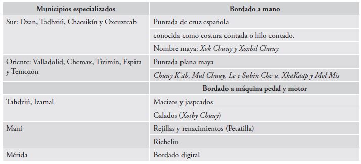 A continuación, se muestra un cuadro resumen en el que se aprecia la especialización por categorías de trabajo en función de la técnica textil empleada, la localización geográfica y los nombres de los municipios yucatecos (cuadro 3).