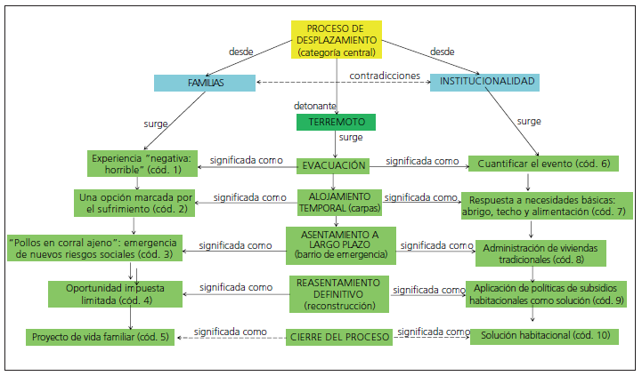 No obstante, esta experiencia espacial de despojo y extrañeza fue mitigada tácticamente por los hogares, los cuales, si bien no buscaron subvertir la vulnerabilidad subyacente, posibilitaron la emergencia de configuraciones de afrontamiento resistentes ante el desplazamiento. Esta capacidad agencial se vio intensificada por el escaso procesamiento institucional ante el desastre, gatillando rupturas del capital social de los lugares afectados y (sobre)utilización de mecanismos rígidos convencionales, como fue el caso de los subsidios habitacionales (Sandoval y Fava 2016; Arteaga et al. 2015).