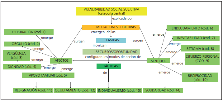 La categoría central de vulnerabilidad social subjetiva (figura 3) se ve mediatizada por configuraciones senti-pensantes, las cuales condicionan/posibilitan el despliegue de capacidades de afrontamiento tácticas al solo resistir y no buscar subvertir la vulnerabilidad social latente del desplazamiento. A continuación, se presentan las cuatro configuraciones tácticas de afrontamiento emergentes: