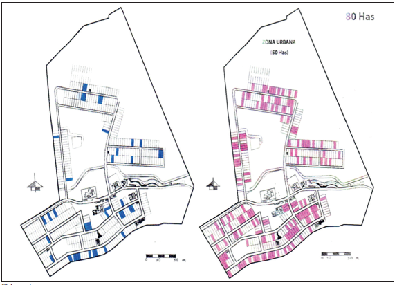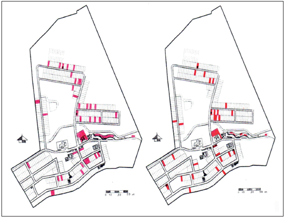 En los mapas 1 y 2 se muestra la actividad comercial en la CRS; con color fucsia se muestra los diferentes negocios en 2011 y con color rojo los de 2016, estos corresponden a venta de pollo, paletas, chicharrines, agua, refresco, bolis, tacos, hielo, arreglo de calzado, peluquería, tiendas de abarrotes, entre otras que los habitantes han adaptado en sus viviendas como medio de subsistencia. Las figuras muestran que la actividad comercial disminuyó, pues en un principio muchos habitantes optaron por este tipo de comercio como opción para tener ingresos, a algunos les dio resultado y se han fortalecido, pero un gran porcentaje desistió.