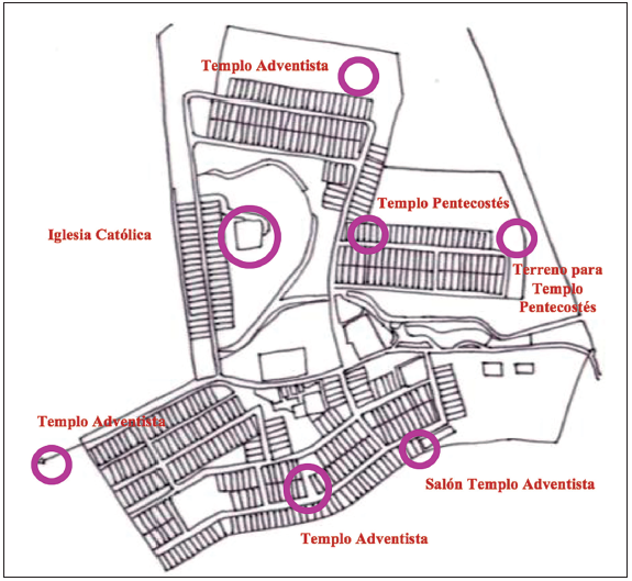 Existen nuevas construcciones destinadas a las prácticas religiosas del templo adventista y pentecostés. Ambos grupos de creyentes solicitaron al IPCR un apoyo para que les fuera otorgado un terreno para construir lugares de oración y a ambos se los concedieron. El proceso de reterritorialización es claro, los practicantes están en aumento y esta actividad es parte importante en la vida cotidiana de los habitantes.