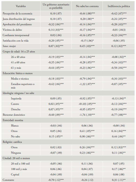 El objetivo del análisis es identificar los determinantes de la probabilidad que una persona externe su apoyo a la democracia, favorezca al autoritarismo, se muestre indiferente ante esas opciones, o bien, omita dar una respuesta. Los resultados del modelo de regresión se presentan en el cuadro 1.