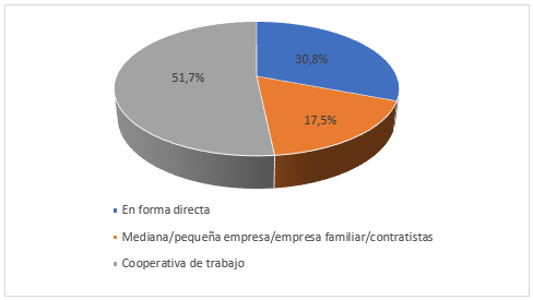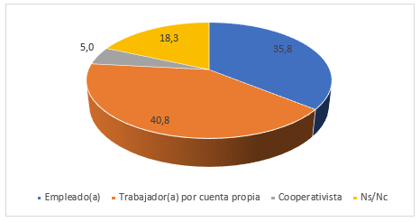 El 67% de los encuestados se integró a las cooperativas entre 2003 y 2006, contando con una experiencia organizativa sostenida entre 15 y 12 años. La población cooperativista involucra trabajadores empobrecidos: solo el 7% encuestado percibía un ingreso familiar por encima de la línea de pobreza. El 44% son empleados, el 46% cuentapropistas y un 6% cooperativistas. Los tipos de trabajo más frecuentes son empleada doméstica, enfermera, acompañante terapéutico, albañil, mantenimiento, maestranza, seguridad y vendedores ambulantes. La mayoría trabaja en el sector privado (81,5%) y muy pocos en el sector público (el 14% a escala nacional y el 2% municipal). Un 53% sufre situaciones de informalidad o precarización (sin obra social ni jubilaciones).