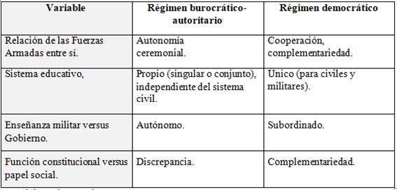 Considerando que la profesionalización del militar no se limita al entrenamiento para la guerra, sino que también implica valores que definen su comportamiento tanto en la guerra como en la paz (Huntington 1964 y 1975; Finer 1975), asumimos que la construcción y consolidación de la democracia en países que pasaron por regímenes burocráticos-autoritarios requieren cambios en la formación del militar para que los soldados privilegien los valores de la democracia (estricto respeto a la ciudadanía inerme, tolerancia a la divergencia, acuerdo con la libre expresión de ideas, aceptación de la heterogeneidad sociocultural de la nación, de la alternancia en el poder y de las elecciones populares de los gobernantes, etc.), en detrimento de aquellos que prevalecieron bajo regímenes autoritarios y que se resumen en el “principio del jefe” (doctrina de las tres D): “No dudes, no diverjas, no discutas” (Rattembach 1972).